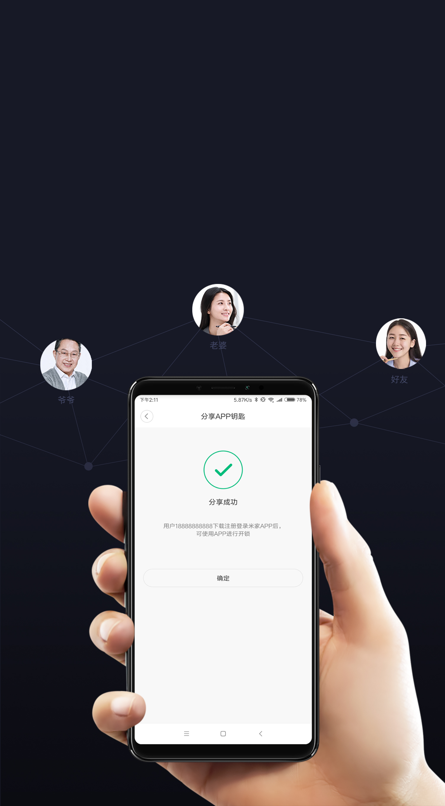 通過米家 APP 一鍵分享藍牙鑰匙,朋友來訪打開米家 APP 即可一鍵開門。給你想給的人,且支持隨時撤回